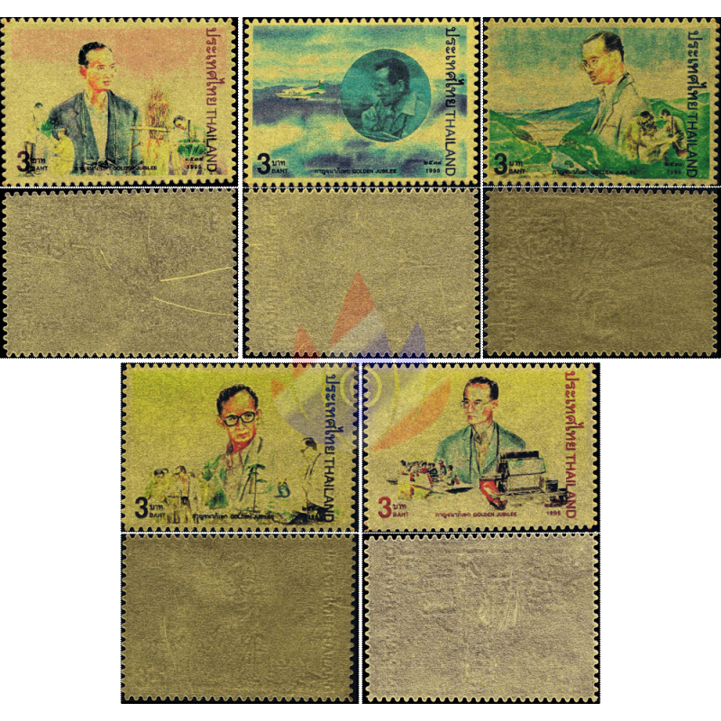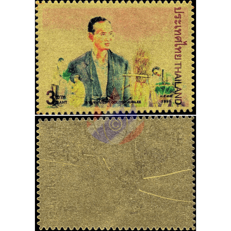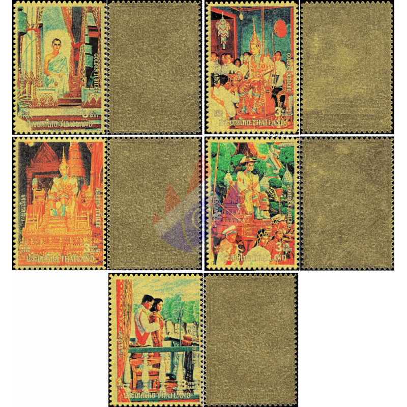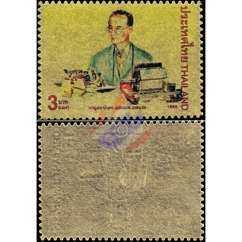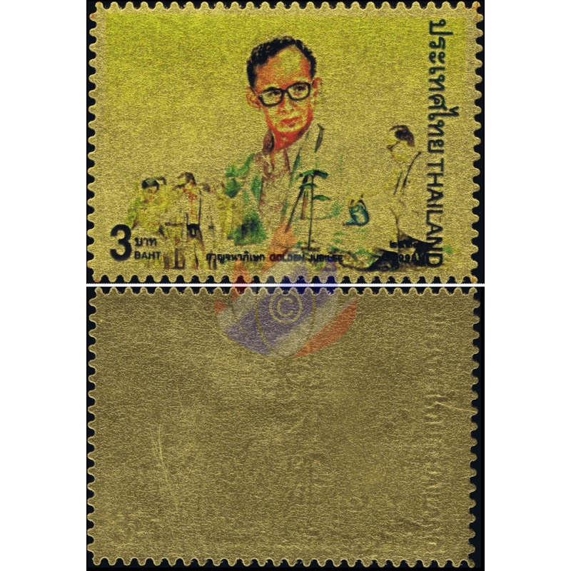 Here as a folder with "MINT NEVER HINGED (MNH)" single stamps and sets with 24K gold plating (99.97%) for the 50th anniversary of Rama IX's accession to the throne