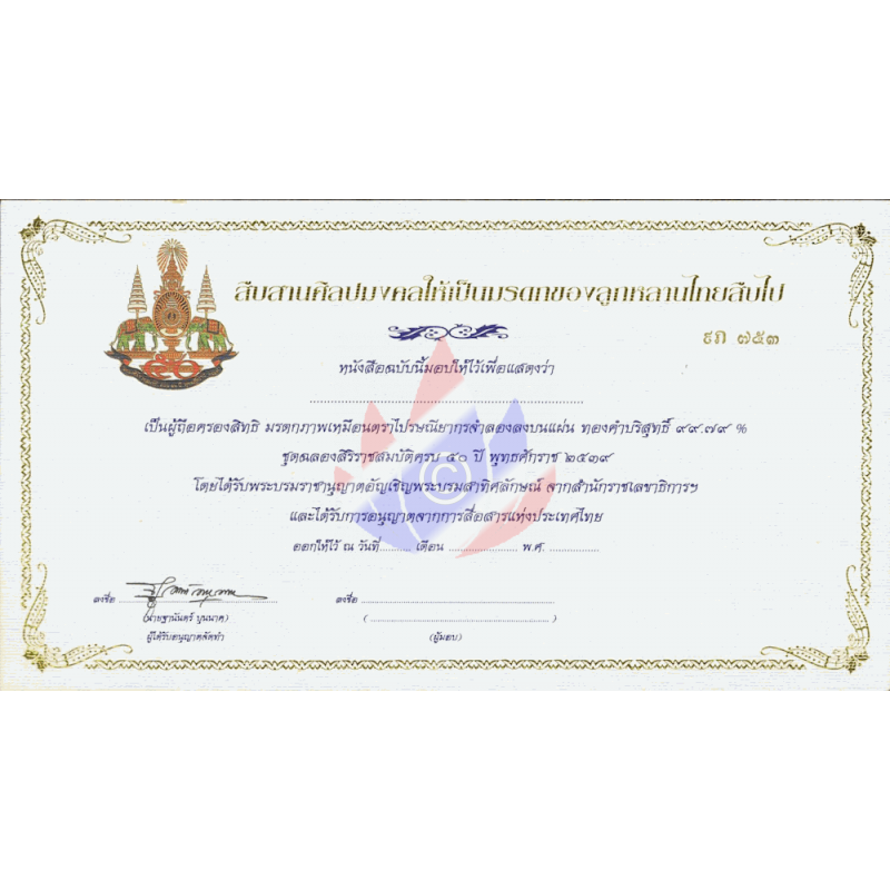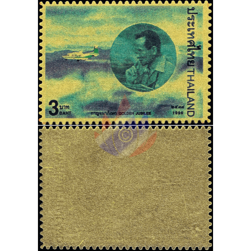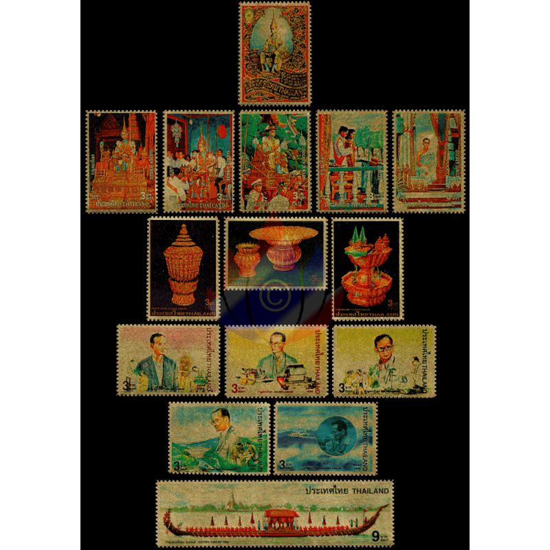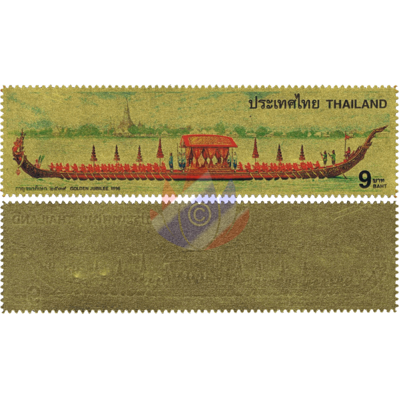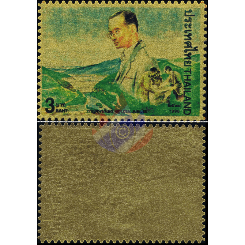 Here as a folder with "MINT NEVER HINGED (MNH)" single stamps and sets with 24K gold plating (99.97%) for the 50th anniversary of Rama IX's accession to the throne