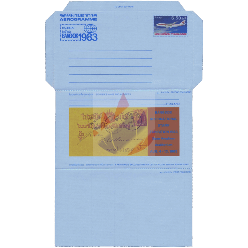 - Das Aerogramm hat das Bangkok 1983 Logo in der oberen linken Ecke in Königsblau und ein Farbbild der ersten Postkarte auf der Rückseite. Das Feld rechts auf der Karte ist dunkel ziegelrot mit blauem Text "BANGKOK INTERNATIONAL STAMP EXHIBITION 1983 Suan Amphorn Auditorium 04. - 13. August 1983"
