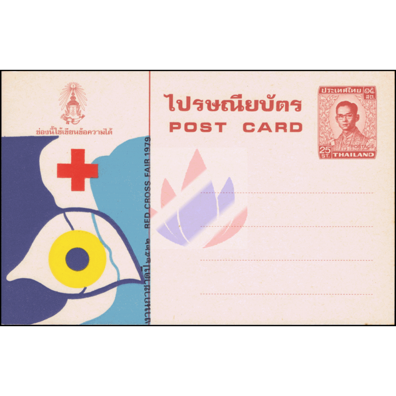 - Die Rote 25 Satang Postkarte der 9. Serie von Rama IX ist sehr kompliziert. Es gibt zwei grundlegende Entwürfe, drei Druckereien, zwei Papierfarben und 22 Aufdrucke.
