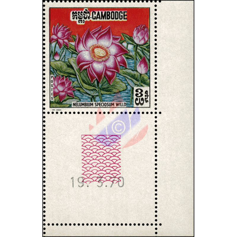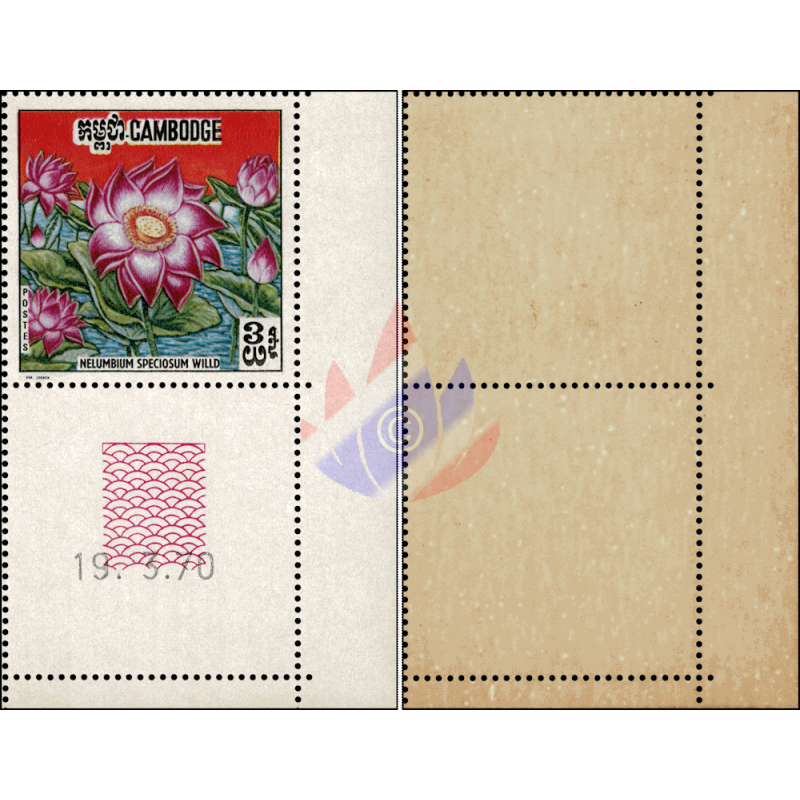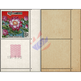 Hier als "POSTFRISCHE (**)" gezahnte Einzelmarke mit vertauschter Kambodschanischer und Arabischer Wertziffer mit Bogenrand und Druck-Datum